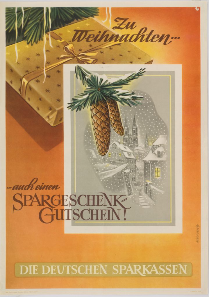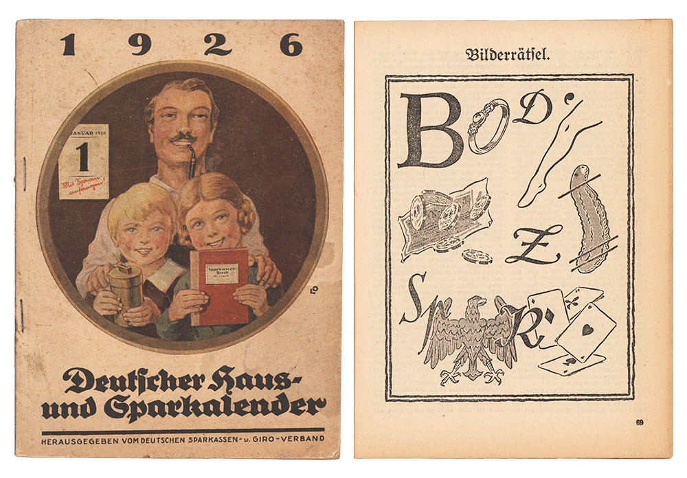 Nach der verheerenden Inflation in der Weimarer Republik engagierten sich die Sparkassen vielfältig, um das Einlagengeschäft wieder aufzubauen. Vertrauensbildende Maßnahmen waren angesagt. Die Menschen sollten zum Sparen mit der neuen und stabilen Währung Reichsmark bewegt werden. Es fanden unterschiedliche Aktionen statt. So wurden etwa verstärkt Heimspardosen ausgeliehen. Auch Druckschriften wurden herausgegeben. Der Deutsche Haus- und Sparkalender ist eine davon. Dieses volkstümliche Heftchen vereint Wissenswertes, Unterhaltendes und natürlich Sparerziehung beziehungsweise Reklame. In unserem Archivbestand befinden sich Exemplare ab 1925. Einige zieren die Namen von historischen Sparkassen aus unserem Verbandsgebiet. Diese zentral produzierten Werbemittel konnten nämlich individualisiert werden.