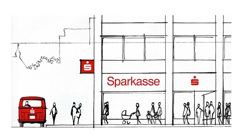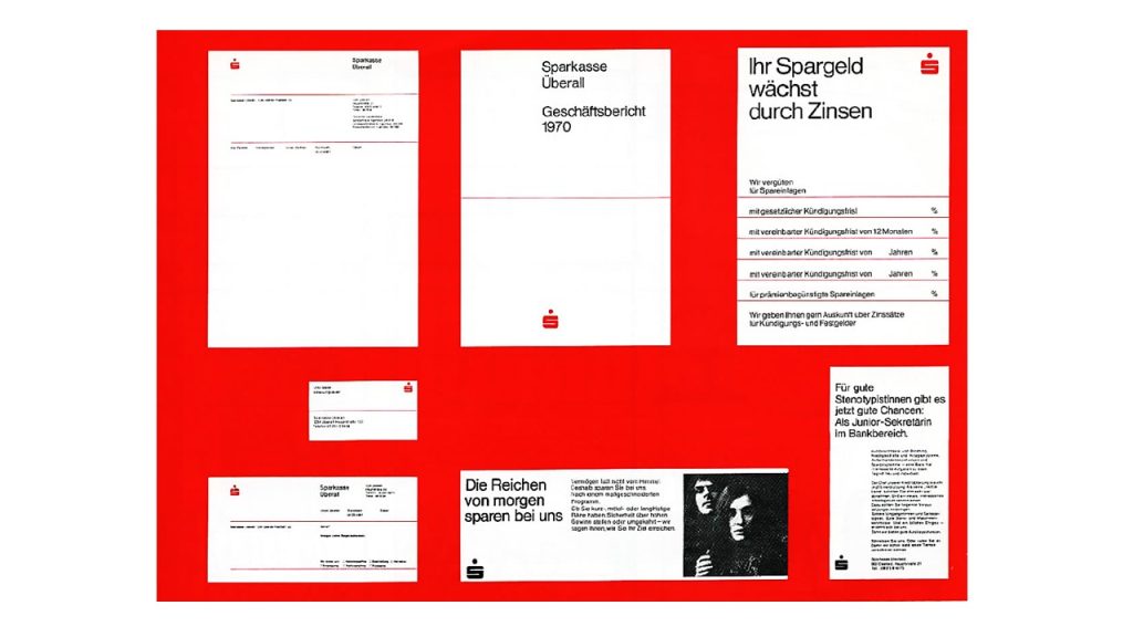 Werfen wir an dieser Stelle noch einmal einen genaueren Blick auf das, wofür die örtlichen Sparkassen sich vor 50 Jahren entscheiden konnten. Einerseits wurden visuelle Konstanten definiert. Dazu gehörten insbesondere das rote Sparkassen-S, der Schriftzug „Sparkasse“, die Hausfarbe „Sparkassenrot“ – HKS 13 sowie die Hausschrift Helvetica und natürlich auch der bekannte Sparkassen-Slogan. Im Detail wurden Musterlayouts für Geschäftsvordrucke, wie Briefpapier, Visitenkarten oder das Sparkassenbuch, für Hausbroschüren, wie Geschäftsberichte, Jubiläumsschriften oder Hauszeitschriften, für die Außenwerbung, für Anzeigen, Bildschirmtext und für die Verbundfirmierung kreiert.