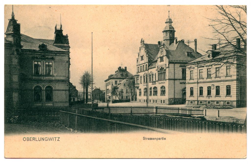 • Die Ansichtskarte zeigt die Straßenpartie mit Sparkasse und Rathaus. (Verlag Georg Mugler, Papierhandlung, Oberlungwitz 1906; Bestand: Historisches Archiv des OSV)