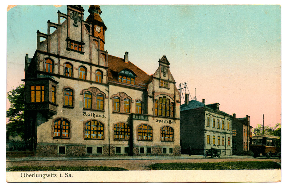 • Die Ansichtskarte zeigt das Rathaus und die Sparkasse mit älteren Fahrzeugen vor dem Nachbargebäude. (Verlag Max Franke, Oberlungwitz, 1919; Bestand: Historisches Archiv des OSV)