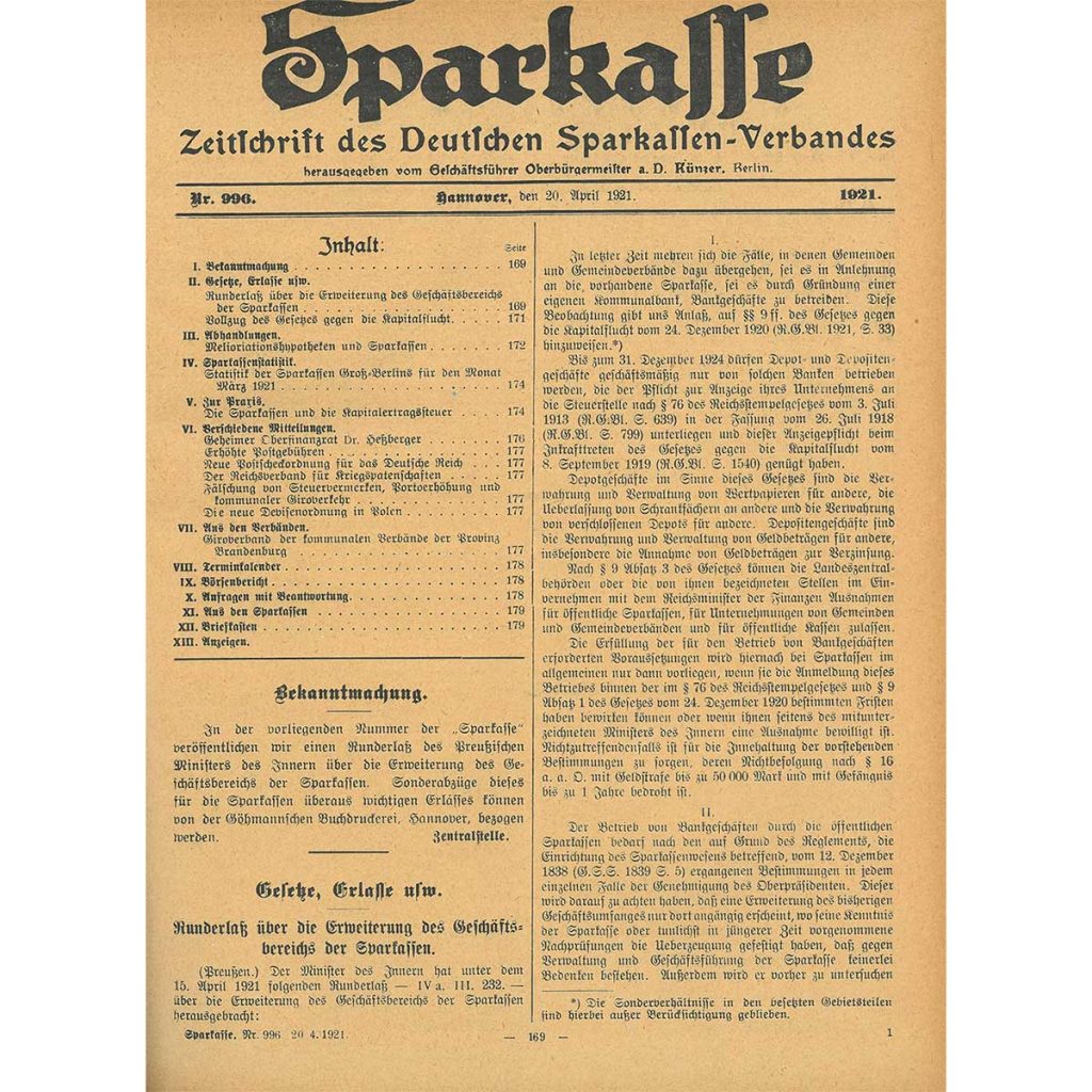 • Der Erlass vom 15. April 1921 wurde in der Sparkasse abgedruckt. Bestand: Sparkassenhistorischen Dokumentationszentrum des DSGV