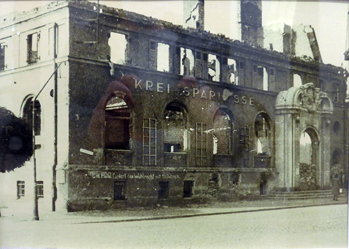 • Das Foto des kriegszerstörten Sparkassengebäudes in Beeskow ist besonders eindrucksvoll. Heute ist die Filiale topsaniert und ein zentraler Anlaufpunkt im Herzen der Stadt. : © Sparkasse Oder-Spree