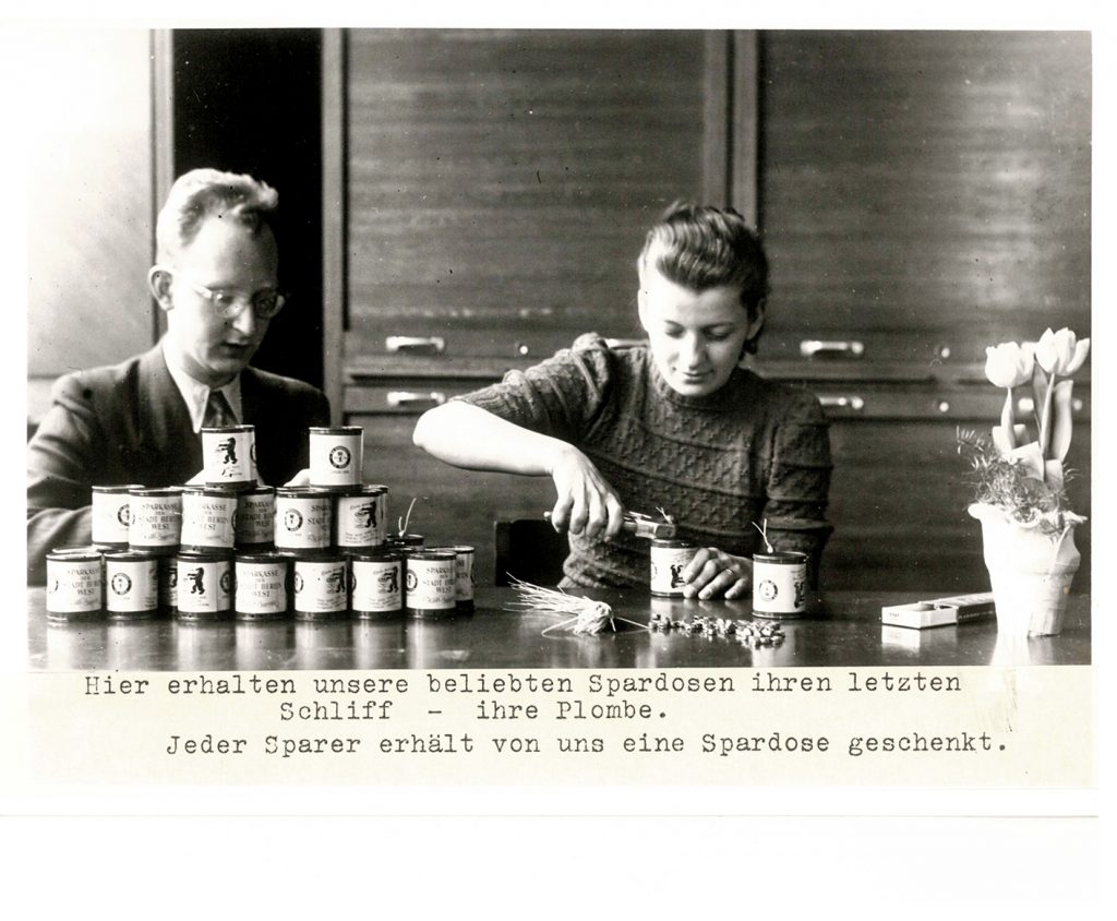 Um 1950 standen noch die traditionellen Heimspardosen aus Metall in ovaler bzw. runder Form bei der West-Berliner Sparkasse im Mittelpunkt. Ein Werbefoto für die Schaufensterwerbung der Zweigstellen aus diesen Tagen zeigt Beschäftigte beim Plombieren der Spardosen, die dann an die Kunden kostenlos abgegeben wurden. Im Geschäftsbericht des Jahres 1950 heißt es dazu: „Die Pflege des Spargedankens diente die Wiederaufnahme des Kleinsparens. Heimspardosen und Spardosen wurden den Sparern zur Verfügung gestellt“. Das Sparen von kleinen Beträgen entwickelte sich sehr erfreulich. Rund 2.300 Spardosen mit einer Gesamtsparsumme von rund 56.000 DM wurden im Laufe des Jahres 1951 geleert. Diese Heimspardosen tragen je nach Form entweder ein auf der Vorderseite angebrachtes kleines Metallschild mit der Bezeichnung „Sparkasse der Stadt Berlin West“ oder als Aufdruck das bis 1955 verwendete runde Unternehmenszeichen mit dem Berliner Stadtwappen und der Inschrift „Die Sparkasse – Die Bank für alle“.
