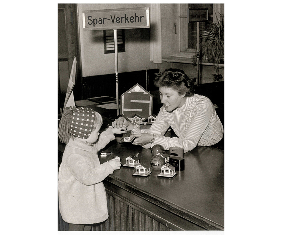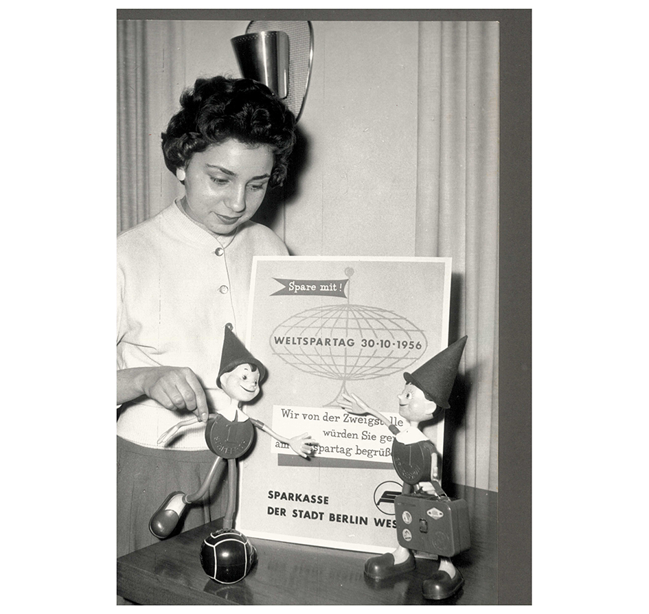 • 1955 stehen für die Kunden der Sparkasse der Stadt Berlin West Spardosen in unterschiedlichen Formen bereit : © Historisches Archiv der Berliner Sparkasse
