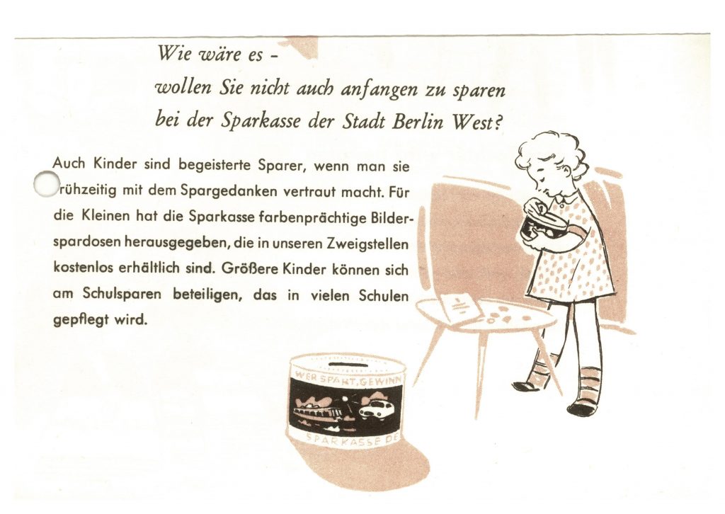 • Kundenbroschüre „Vom Segen des Sparens“ der Sparkasse der Stadt Berlin West von 1957.