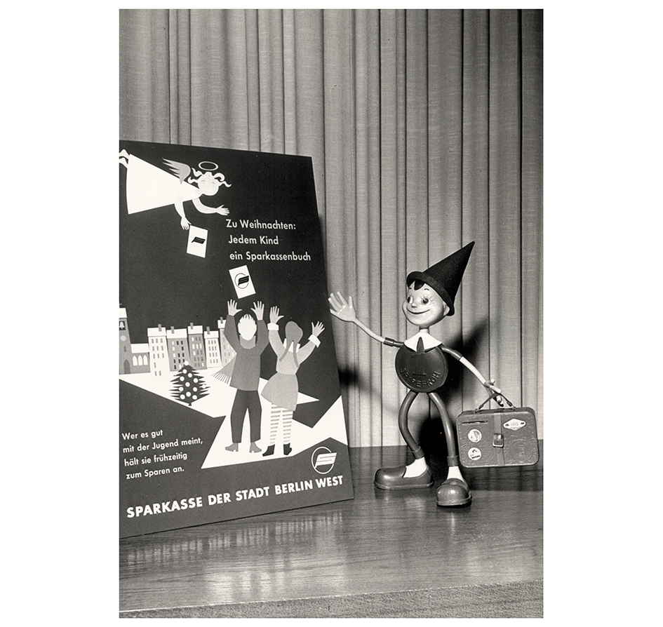 • Sparwerbung zu Weihnachten 1957 mit der Werbefigur „Sparefroh“ und die Reisekofferspardose : © Historisches Archiv der Berliner Sparkasse