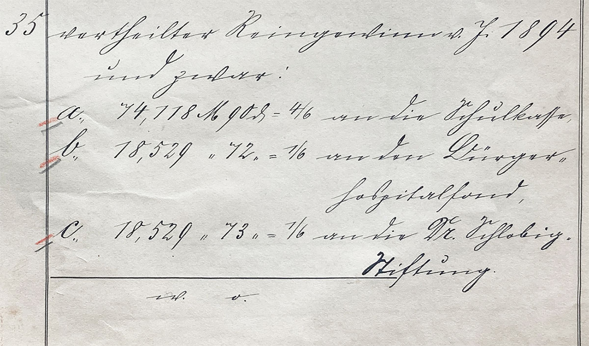 Auch anlässlich des historischen Jubiläums zeigte man sich übrigens spendabel. Am Schluss seines Referats zur Entwicklungsgeschichte der Sparkasse verkündete Dr. Hornig die Gründung einer Stiftung. Nach dem Rückschlag der Inflation stellten zunächst 5.000 Reichsmark das Kapital dar. Dies war der den Gewinnen der Wertpapierabteilung der 1910 gegründeten kommunalen Girokasse zu verdanken. Die Zinserträge sollten bedürftigte Angestellte und Beamte der Stadt erhalten.