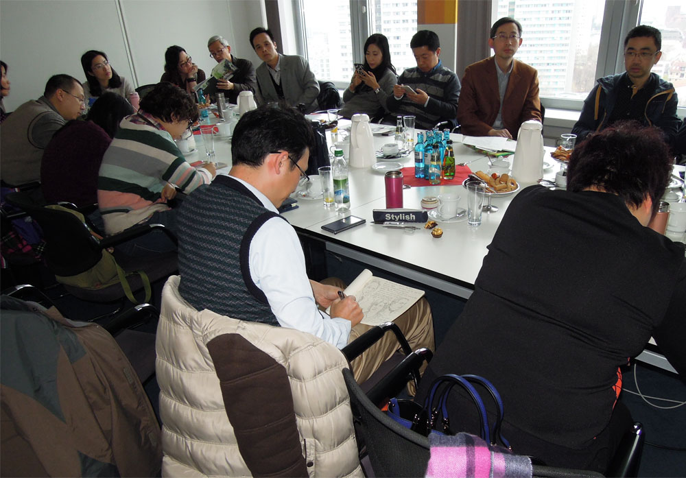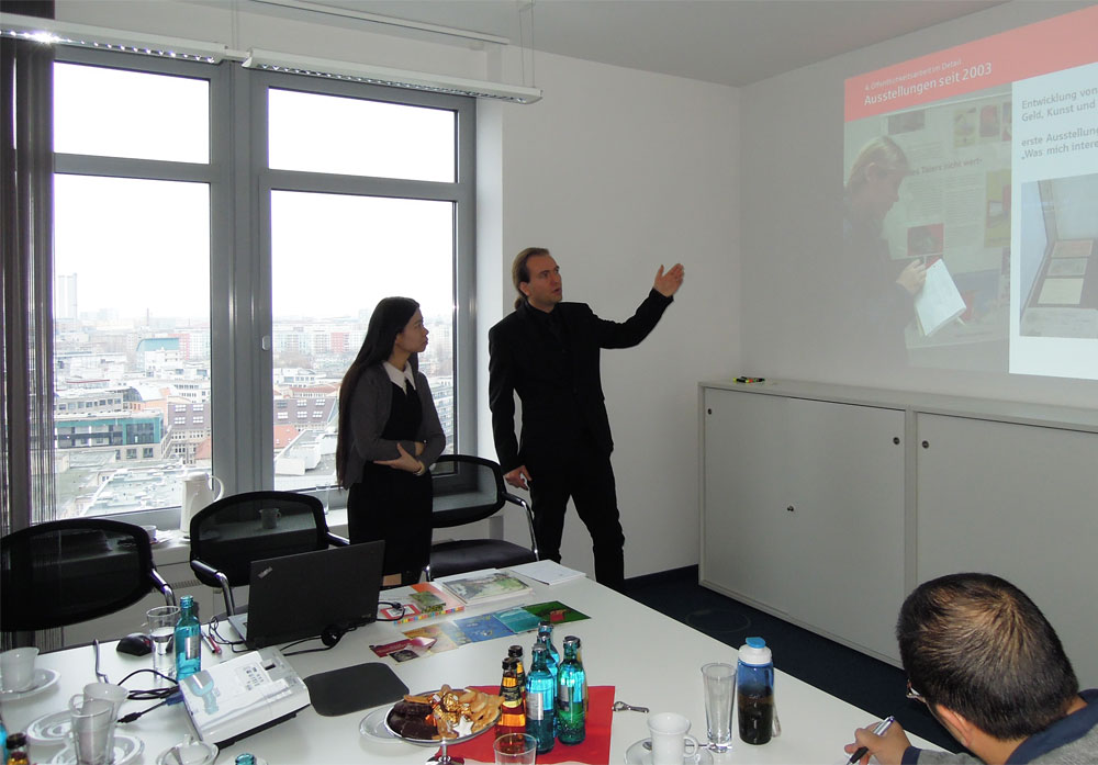 Heute besuchten uns nun insgesamt 19 chinesische Archivleiterinnen und Archivleiter. Der Geschäftsführende Präsident des Ostdeutschen Sparkassenverbandes (OSV), Dr. Michael Ermrich, hieß die Gäste im Bürogebäude am Berliner Spittelmarkt herzlich willkommen. Mit einer kurzen Vorstellung des Verbandes, seiner Mitglieder und Aufgaben stimmte er auf den anschließenden Fachvortrag ein.