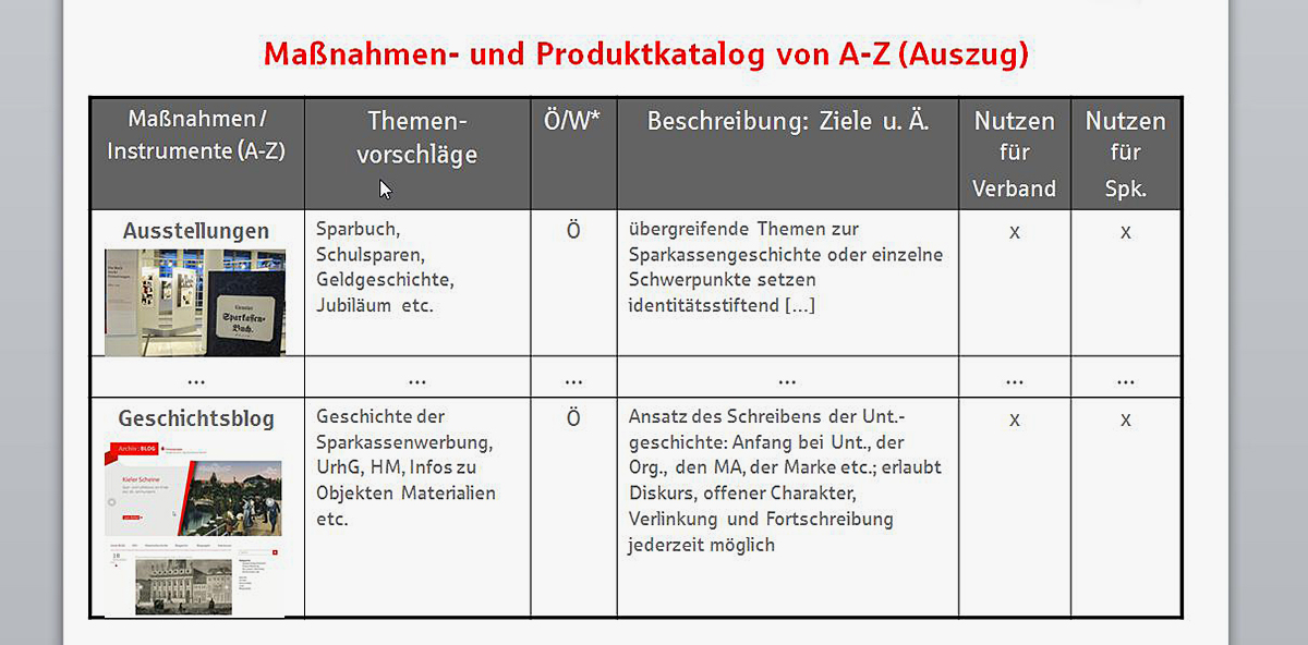 Gleichzeitig dient der Katalog als Basisdokument, um für jede Sparkasse passgenaue History-Marketing-Strategien zu entwickeln. Zentrale Anknüpfungspunkte sind dabei ebenso bedeutsam wie regionalgeschichtliche Bezüge.