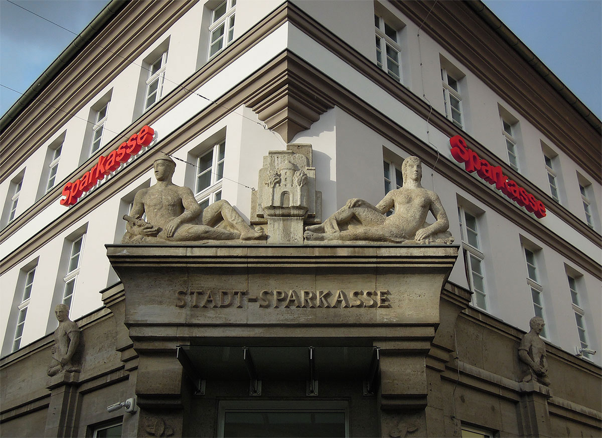Vom Architekten und Regierungsbaumeister a.D. Kurt Vogeler stammt der Entwurf für das Haus. Der Bildhauer Walter Lemcke gestaltete unter anderem die interessanten Sandsteinfiguren an der Fassade. Sie nehmen Bezug auf örtliche Wirtschaftszweige, mit denen das Geldinstitut Geschäftsbeziehungen pflegte. Schauen Sie sich gern das zweite Bild des Blogs an. Über dem Eingangsportal sehen Sie links Merkur, den antiken Gott/ Schutzpatron der Reisenden, des Handels und der Wissenschaften. Rechts symbolisiert eine Frau die Güterzeugung, die Industrie.