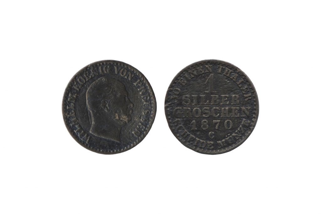 Jahrzehntelang hatten die preußischen Sparkassen mit diesem kleinen Geldstück zu tun, dem Silbergroschen. Eingeführt wurde er durch ein Münzgesetz im Jahr 1821. Fortan machten 30 dieser Stücke einen Taler, wie auch auf der Vorderseite zu lesen ist. Die neue Rechnungsweise stellte schon einen Schritt in Richtung Dezimalsystem dar, wenngleich weiterhin 12 Pfennige einen Groschen ergaben. Wie der Name sagt, war die Münze aus Silber, allerdings nur zum Teil. Der Feingehalt dieses Exemplars betrug lediglich 220/1.000, das Feingewicht also magere 0,483 Gramm! Eigentlich irreführend. Weil sie nicht nur aus Kupfer bestanden, wurden sie im Gegensatz zu den Kupfergroschen als Silbergroschen bezeichnet. Bis 1873 wurden die silberhaltigen Groschen geprägt. Noch drei weitere Jahre galten sie im Wert eines 10-Pfennig-Stücks als Zahlungsmittel. Da hatten die Sparkassen längst ihre Bücher umgestellt auf Mark und Pfennig.