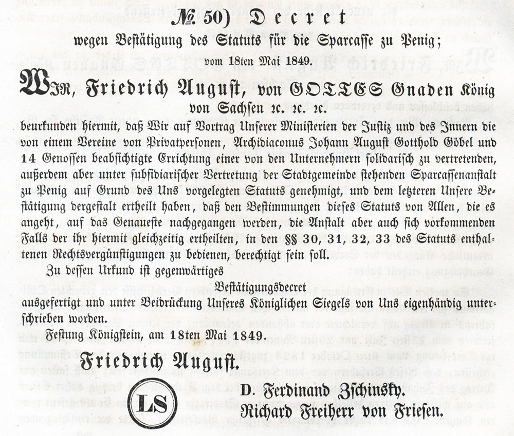 Auf der Festung Königstein bestätigte der während des Dresdner Maiaufstands geflohene sächsische König Friedrich August II. vor 170 Jahren das Statut der Sparkasse in Penig. Ein besonderer Fall. Denn normalerweise holten Sparkassengründer die Genehmigung vor der Geschäftsaufnahme ein. Diese war in Penig 1847. 1849 wurde nachträglich eine Satzung abgesegnet, die gewisse Rechtsvorteile brachte. Nur von der Obrigkeit genehmigte Sparkassen sollten zum Beispiel zur Anlegung von Mündelgeldern genutzt werden.