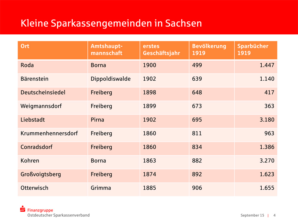 Das ist heute schwer vorstellbar. Sogar Orte mit geringer Bevölkerungszahl hatten 1919 eine eigene Sparkasse. Die zehn kleinsten Gemeinden habe ich hier für Sie zusammengefasst. Sie sind nach der Einwohnerzahl geordnet. Auffällig ist die Verbreitung in der Amtshauptmannschaft Freiberg. Dies war der untere Verwaltungsbezirk, der die meisten Sparkassen in Sachsen aufwies. So kam hier eine Kasse auf durchschnittlich 23 km² oder 2.809 Einwohner, was weit über dem Landesdurchschnitt lag.