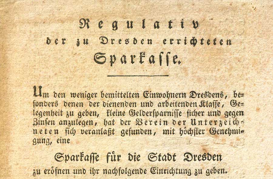 Bei Sparkassen zählten Frauen wahrscheinlich schon von Anfang an zur Kundschaft. Jedenfalls wurden sie frühzeitig in den Statuten angesprochen. Konkret ermöglichte man männlichen und weiblichen Dienstboten das Sparen. Bereits bei der ersten Sparkasse der Welt in Hamburg konnten sie 1778 vorsorgen. Auch in vielen jüngeren Satzungen begegnet uns die Kundengruppe. So wollte zum Beispiel 1821 die Kasse in der sächsischen Haupt- und Residenzstadt Dresden insbesondere für diesen Teil der arbeitenden Bevölkerung da sein.