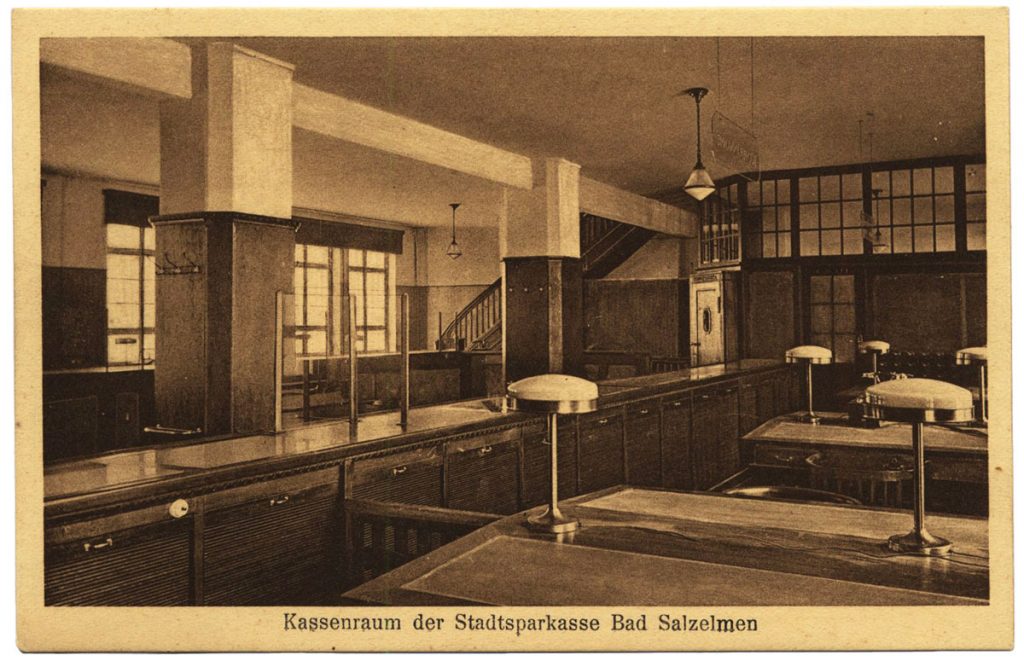 Innenansichten sind nur wenige überliefert. Einen Einblick gewährte zum Beispiel die Stadtsparkasse Bad Salzelmen im heutigen Sachsen-Anhalt. Dieses Institut hatte eine verhältnismäßig kurze Geschichte. Eine Sparkasse bestand in Groß Salze seit 1894. Die Umbenennung in Bad Salzelmen war 1926. Sechs Jahre später erfolgte die Eingemeindung nach Schönebeck (Elbe), dessen Stadtsparkasse dadurch eine weitere Geschäftsstelle bekam.