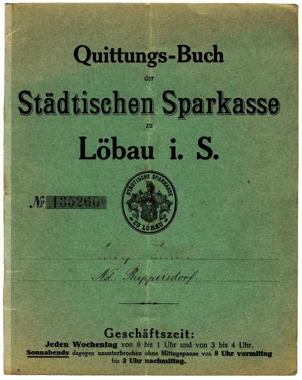 Zu den größeren Büchern zählt mit einer Länge von 22 und einer Breite von 17,6 Zentimetern dieses Quittungsbuch einer sächsischen Sparkasse aus dem Jahr 1919. Die Maße scheinen dem Eigner (Name retuschiert) recht unpraktisch gewesen zu sein. Das Dokument wurde in der Mitte gefaltet, um es zum Beispiel in der Jackentasche unterbringen zu können.