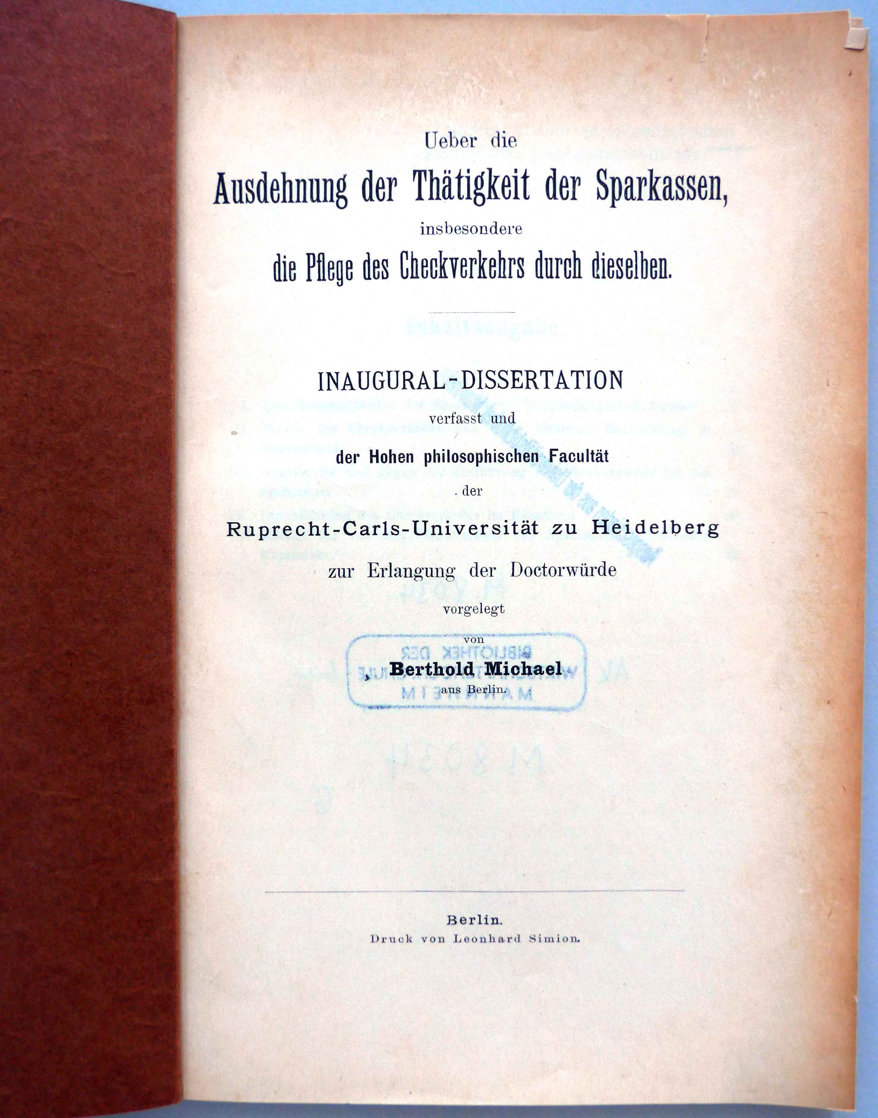 Im Alter von nur 28 Jahren hatte der Sohn des Berliner Genremalers Max Michael an der altehrwürdigen Ruprecht-Karls-Universität Heidelberg sein 84-seitiges Werk „Ueber die Ausdehnung der Thätigkeit der Sparkassen, insbesondere die Pflege des Checkverkehrs durch dieselben“ eingereicht, um die Doktorwürde zu erlangen.*