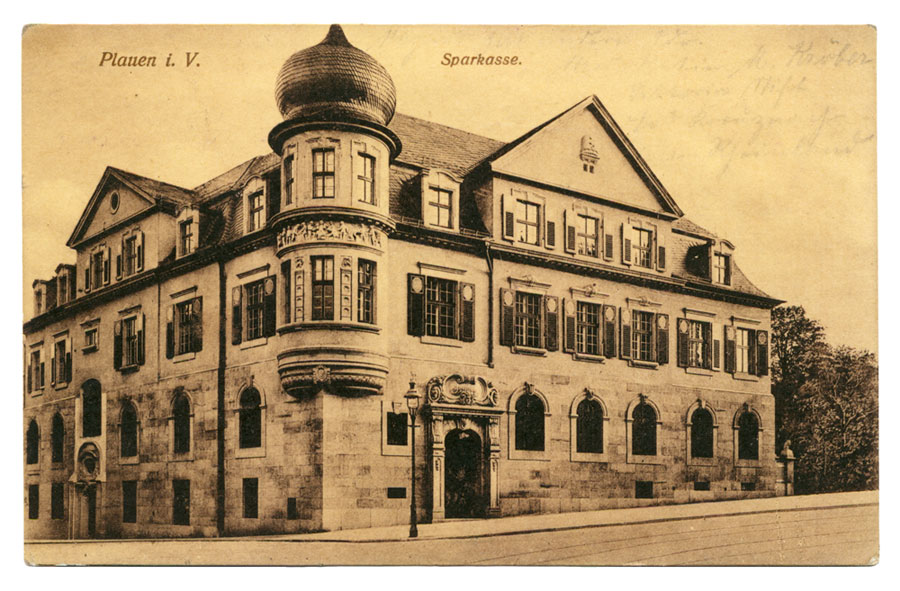 Die Städtische Sparkasse in Plauen existierte als Institut von 1839 bis 1943. (Ansichtskarte unbekannter Verlag, versendet 1915; Bestand: Historisches Archiv des OSV)