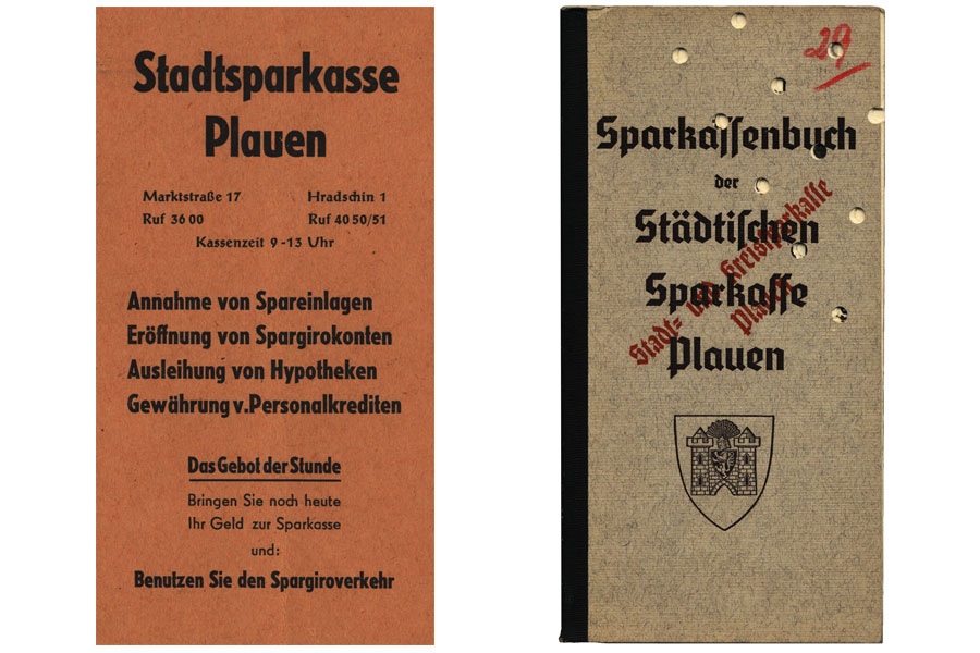 Werbeanzeige der Stadtsparkasse Plauen, die von 1945 bis 1951 bestand, und Sparbuch des Nachfolgeinstituts, der Stadt- und Kreissparkasse Plauen : © Historisches Archiv des OSV