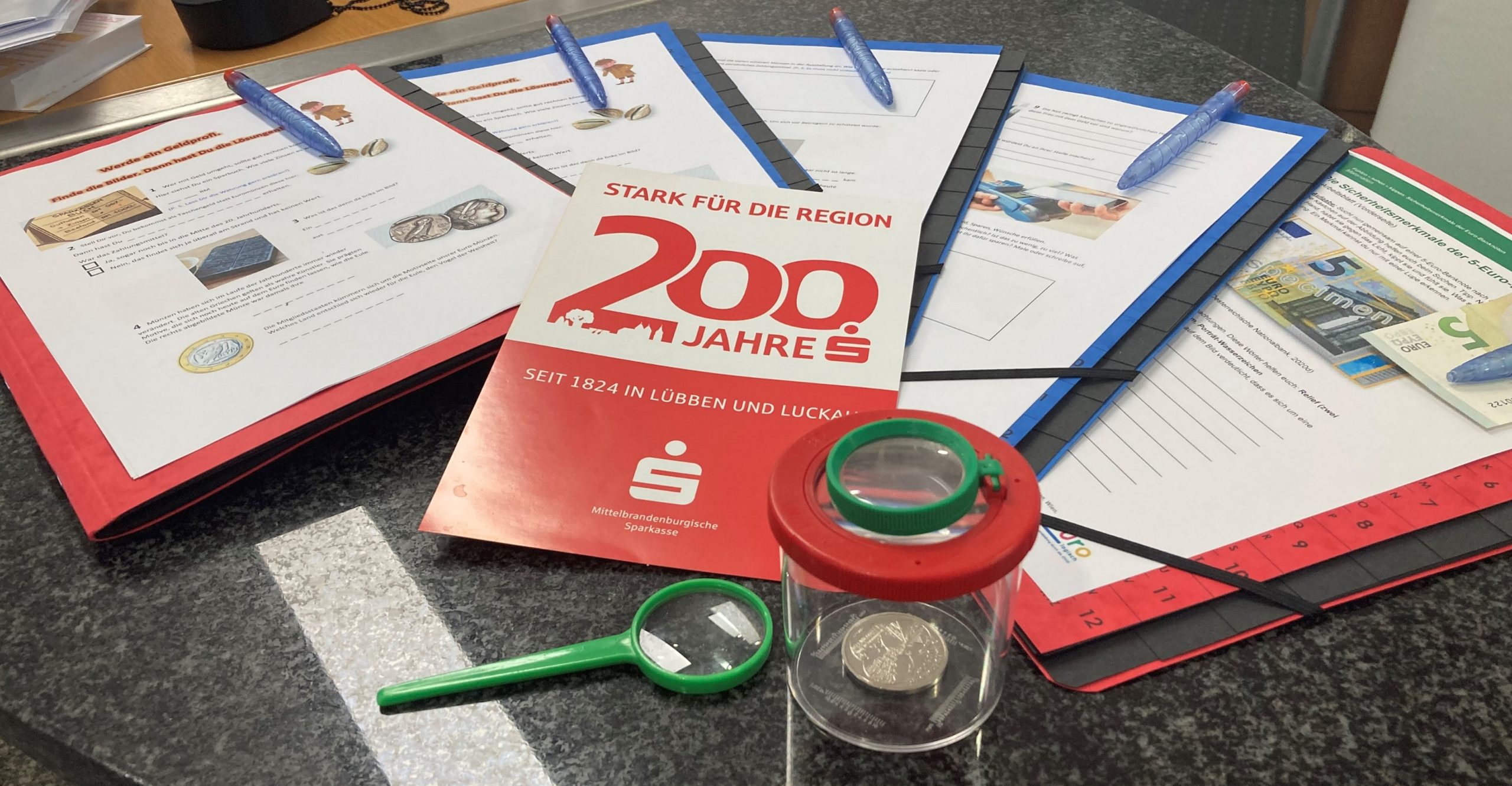 Im Moment feiert die MBS an den Standorten Lübben und Luckau ihr 200-jähriges Bestehen. Mit dabei sind die Ausstellungen rund ums Geld und rund ums Sparbuch. Kurz vor den Ferien besuchten zwei 5. Klassen die Geschäftsstelle Lübben. In kleinen Gruppen erarbeiteten sie sich nicht nur spannende Fakten aus der jahrtausendealten Geschichte der Tausch- und Zahlungsmittel. Sie beschäftigten sich auch mit Themen, die sie ganz persönlich betreffen, wie zum Beispiel das Taschengeld und das Sparen zur Erfüllung persönlicher Wünsche. Daneben standen die Sicherheitsmerkmale unserer Euro-Scheine auf dem Programm. Fleißig suchten die Schülerinnen und Schüler nach Reliefs, Farbveränderungen, Wasserzeichen und Sicherheitsfaden. Mit Lupe und echtem Geldschein meisterten sie die Aufgabe ganz hervorragend.