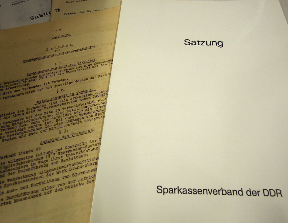 Auch die Arbeitsgruppe um Rainer Voigt ist in der Weihnachtszeit aktiv. Sie beschäftigt sich mit der Frage, was ein Sparkassenverband der DDR zu leisten hat. In der „Abteilung ‚Sparkassen‘ der Staatsbank erinnerte man sich an die alten Verbandsstrukturen der Jahre 1945 bis 1952“**, sodass man mit den Ideen nicht bei Null anfangen muss. Die lange Tradition der Sparkassenorganisation kommt den erfahrenen Mitarbeitern nun zugute. Sie können auf die vorhandenen Satzungen der Sparkassenverbände der einzelnen Länder zurückgreifen, die 1947/1948 neu in Kraft getreten waren. Es ist also eine Grundlage vorhanden, auf der sich aufzubauen lohnt.***