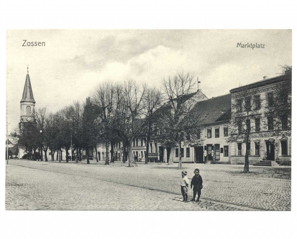 Im Haus am Markt Nummer 16 in Zossen (hinter den beiden Jungen) befand sich die Sparkassennebenstelle der Guerckes. (Ansichtskarte Verlag Buch- und Papierhandlung des Zossener Stadt- und Landboten, um 1910; Bestand: Historisches Archiv des OSV)