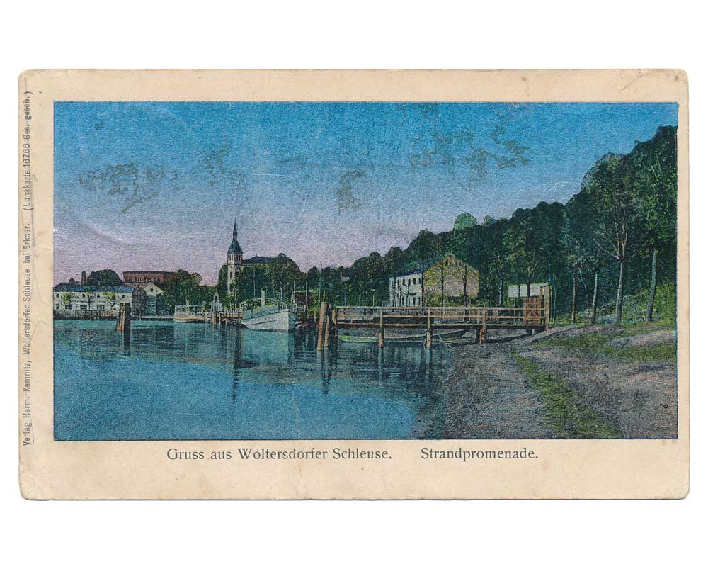 Das idyllische Woltersdorf war damals und ist heute ein beliebtes Ausflugsziel. Im Ort befindet sich jetzt eine Geschäftsstelle der Sparkasse Oder-Spree. (Ansichtskarte Verlag Hermann Kemnitz in Woltersdorf, um 1900; Bestand: Historisches Archiv des OSV)