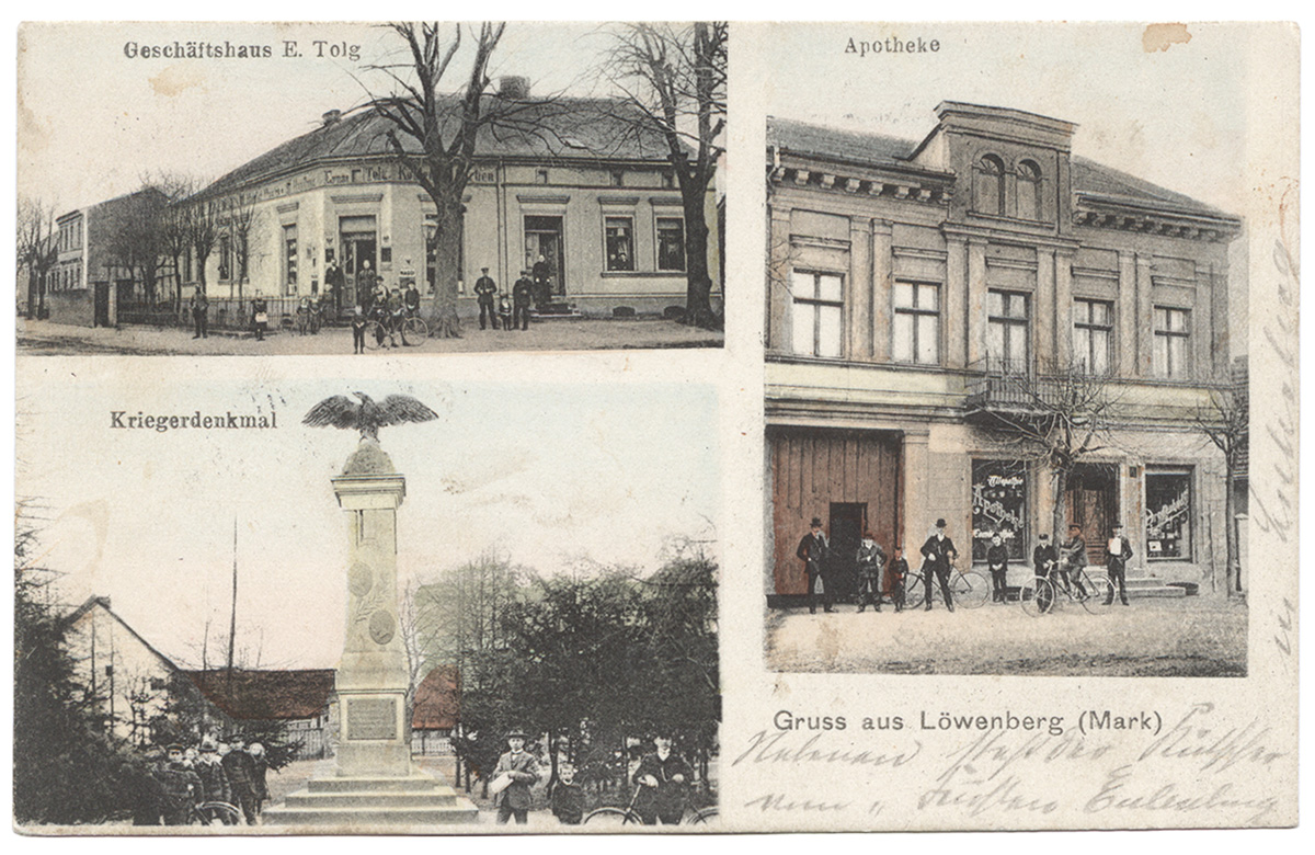 • Das Geschäft von Ernst Tolg in Löwenberg war vor 100 Jahren eine Sparkassen-Agentur. (Ansichtskarte Verlag Paul Klinke in Berlin, versendet 1913; Bestand: Historisches Archiv des OSV)