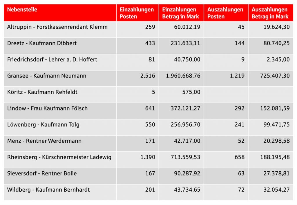 • Die unterschiedliche Frequentierung der Nebenstellen der Ruppiner Kreissparkasse im Jahr 1919 verdeutlicht die Tabelle. : © Historisches Archiv des OSV