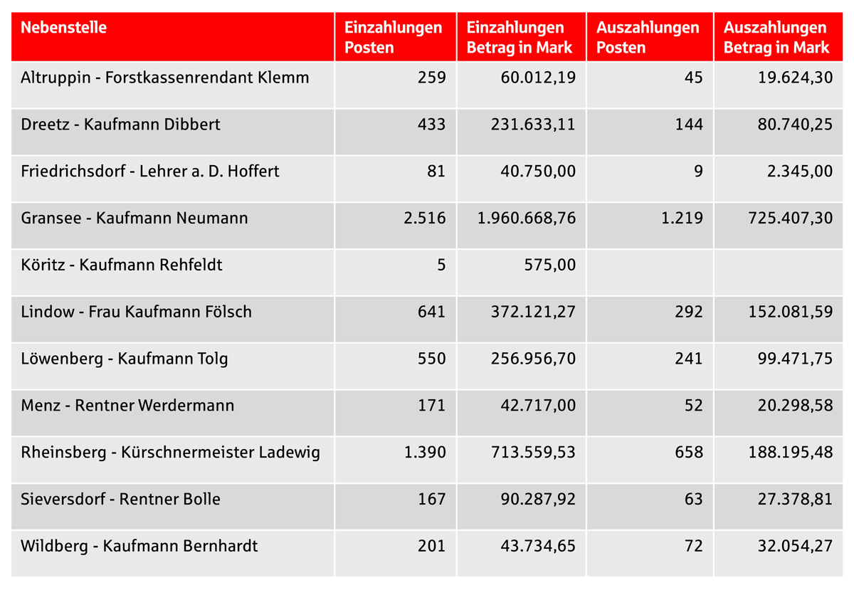 Dieses Institut verfügte vor 100 Jahren über neun Nebenstellen: Dreetz, Friedrichsdorf, Gransee, Lindow, Löwenberg, Menz, Rheinsberg, Sieversdorf und Wildberg. 1919 kamen noch Altruppin und Köritz dazu. Geöffnet war damals den ganzen Tag über, während die Hauptgeschäftsstelle in Neuruppin von 8:00 bis 13:00 Uhr Kassenstunden hatte.
