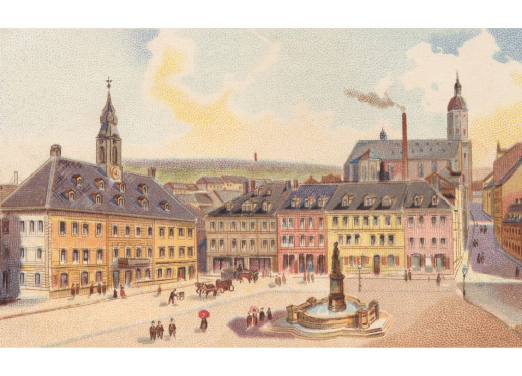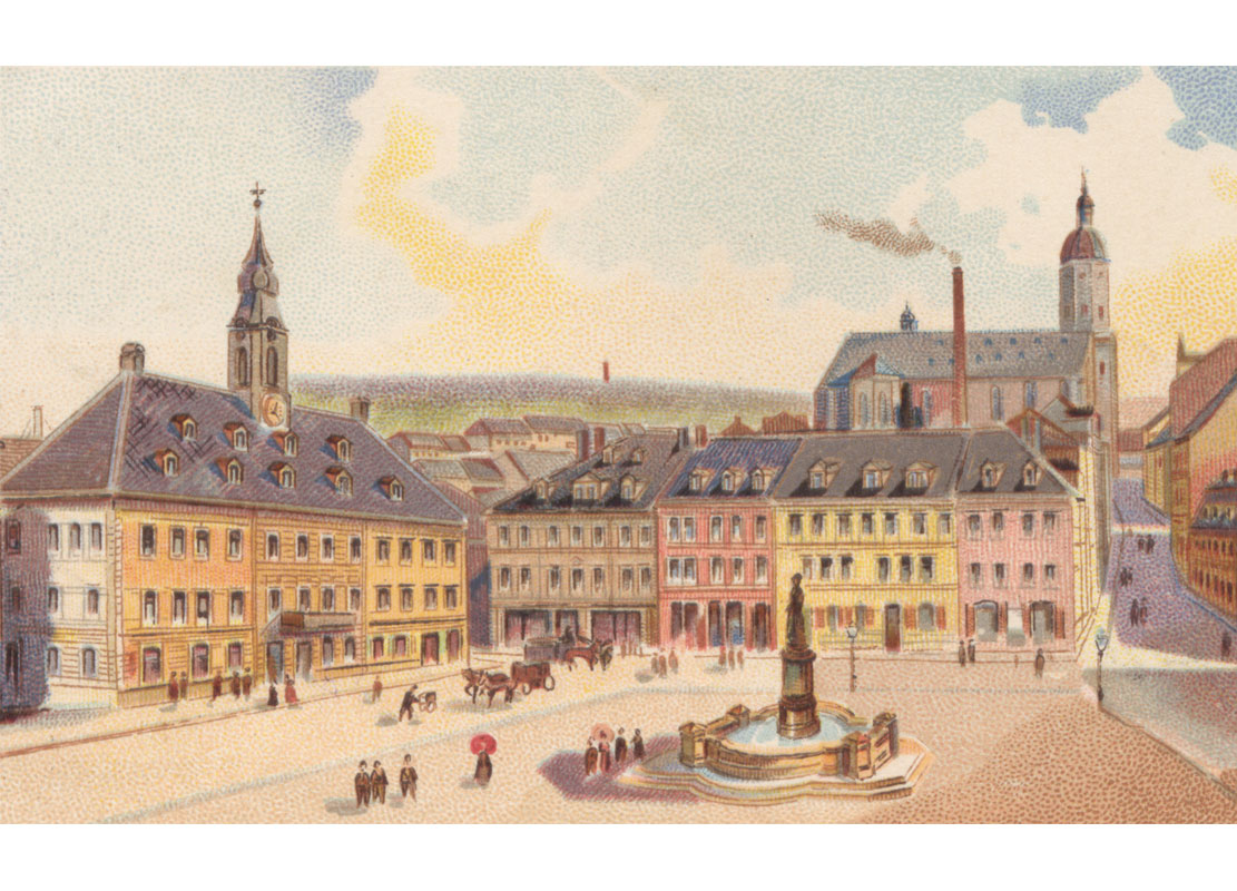 • Am Annaberger Markt befand sich 1857 links im Rathaus der Sitz der Stadtsparkasse. Rechts neben der St. Annen-Kirche hat heute die Erzgebirgssparkasse ihren Hauptsitz. (Abb. Ausschnitt Ansichtskarte Lith. Anstalt Gebrüder Pilz in Schlettau, versendet 1901; Bestand: Historisches Archiv des OSV)