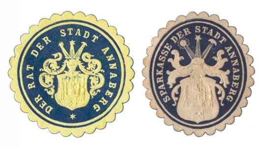 • Siegelmarken des Stadtrates und der Stadtsparkasse mit dem Wappen von Annaberg, um 1900 : © Historisches Archiv des OSV