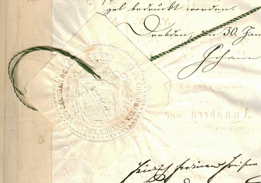 • Ausschnitt der Genehmigung der Sparkasse durch König Johann von Sachsen am 30. Januar 1857 - mit Siegel und Unterschrift : © Historisches Archiv der Erzgebirgssparkasse