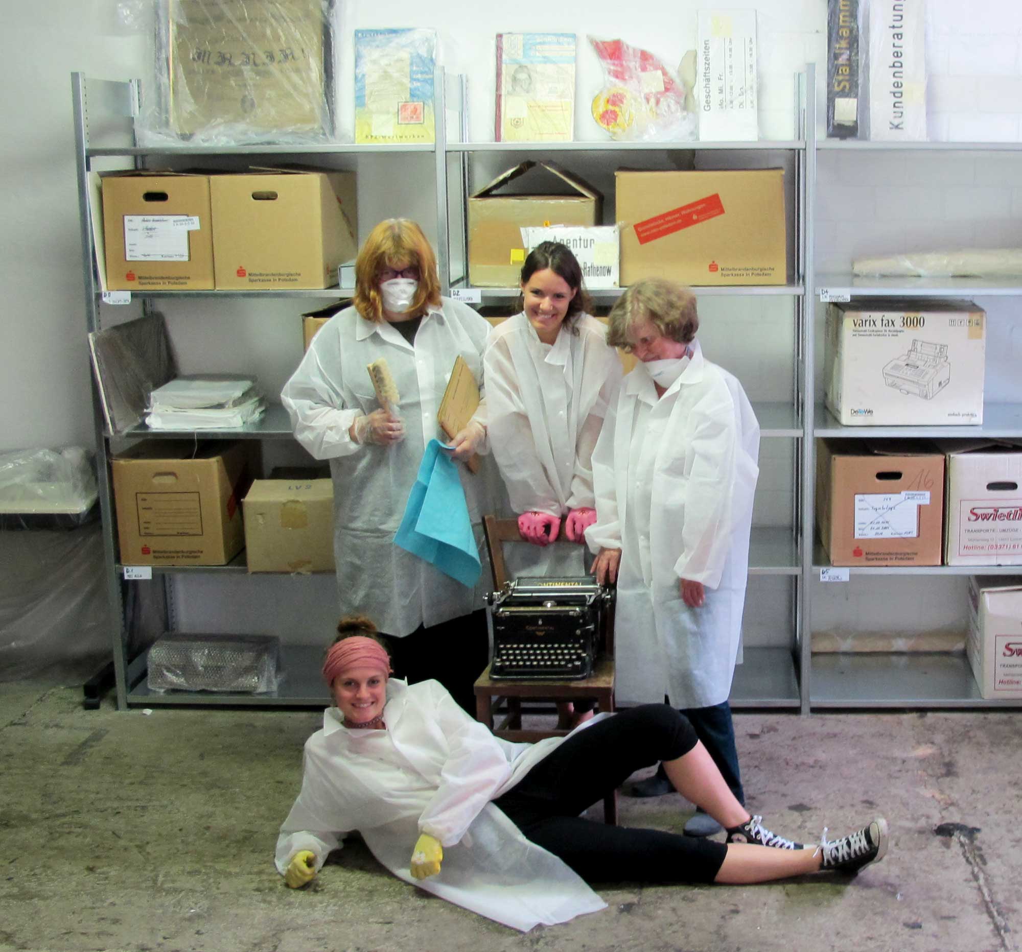 So kam es, dass fünf Studenten und die Schreiberin dieser Zeilen am vergangenen Freitag gut „verpackt“ durch Atemschutzmasken, Gummihandschuhe und Kittel sowie „bewaffnet“ mit Ziegenhaarbesen und Reinigungstüchern erneut in einem Außenarchiv der MBS arbeiteten. Die Sparkasse konnte ihre langjährige Zusammenarbeit mit der Universität Potsdam nutzen und hatte ein Team für das Projekt „Aufbau eines historischen Archives für die MBS“ gewonnen.