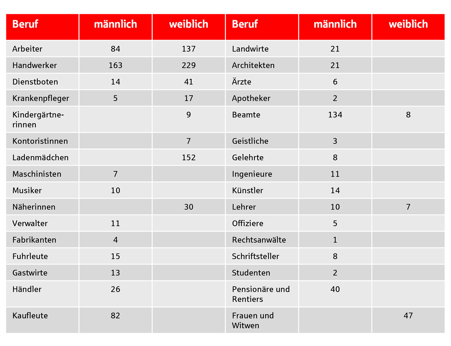 Insgesamt wurden 1909 bereits 1.428 Schließfächer genutzt, davon 1.301 zur Verwahrung der Sparbücher. Die Kreissparkasse wusste nicht nur, was bei ihr hinterlegt wurde. Im Geschäftsbericht listete sie auf, welche Berufsgruppen die Fächer nutzten. Da gab es etwa 229 Handwerkerinnen und 163 Handwerker, 137 Arbeiterinnen und 84 Arbeiter sowie 134 Beamte und 8 Beamtinnen. Die Sparkasse notierte tatsächlich, wie viele Kundinnen und Kunden sie hatte. In der Aufstellung tauchen zeittypisch auch Tätigkeiten auf, die nur einem Geschlecht vorbehalten waren. Wenn Sie sich dafür interessieren, so klicken Sie gern zu Bild 2 des Beitrags.