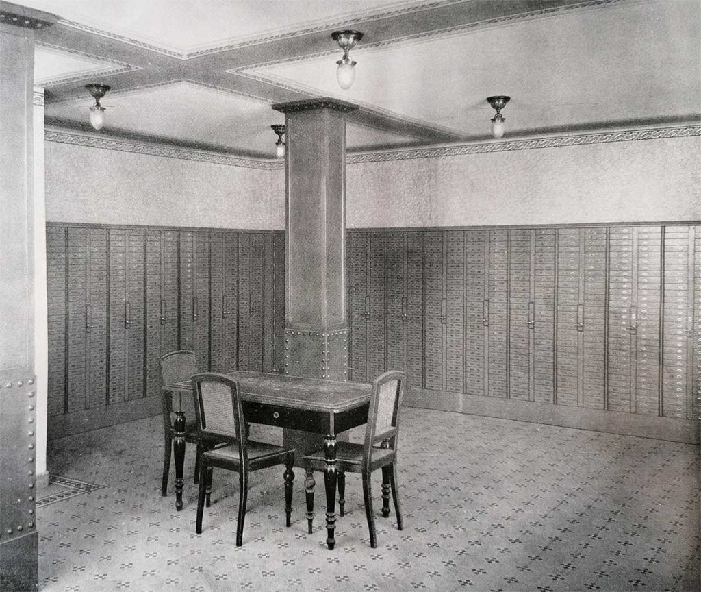 • Schließfächer für Sparbücher in der Stahlkammer der Teltower Kreissparkasse (Abb. in: Petersilie, Erich: Die Sparkasse des Kreises Teltow von 1858-1908, Berlin, 1908; Bestand: Historisches Archiv des OSV) : © Historisches Archiv des OSV
