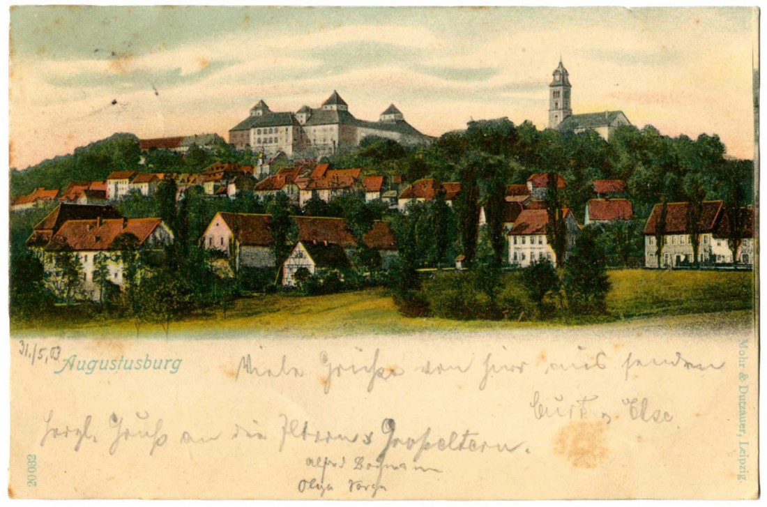 Das Schloss Augustusburg im Hintergrund wurde im 16. Jahrhundert errichtet, der Ort Schellenberg 1899 in Augustusburg umbenannt. (Ansichtskarte Verlag Mohr & Dutzauer in Leipzig, versendet 1903; Bestand: Historisches Archiv des OSV)