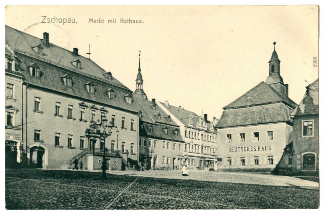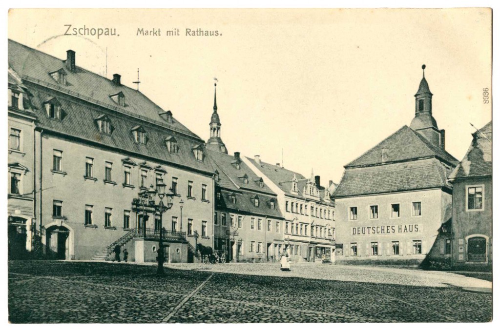 Sowohl im alten Rathaus (später "Deutsches Haus") als auch im neuen Rathaus (links) befand sich im Laufe der Geschichte die Stadtsparkasse Zschopau. (Ansichtskarte, unbekannter Verlag, versendet 1910; Bestand: Historisches Archiv des OSV)