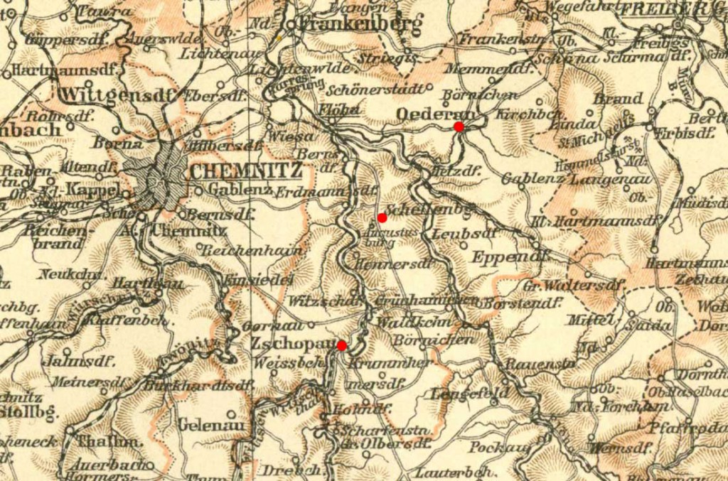 • Die Filialen der Sparkasse für den Amtsbezirk Augustusburg auf einen Blick: Zschopau, Schellenberg und Oederan. (Ausschnitt Landkarte Königreich Sachsen, vor 1899; Privatbestand Thomas Einert)