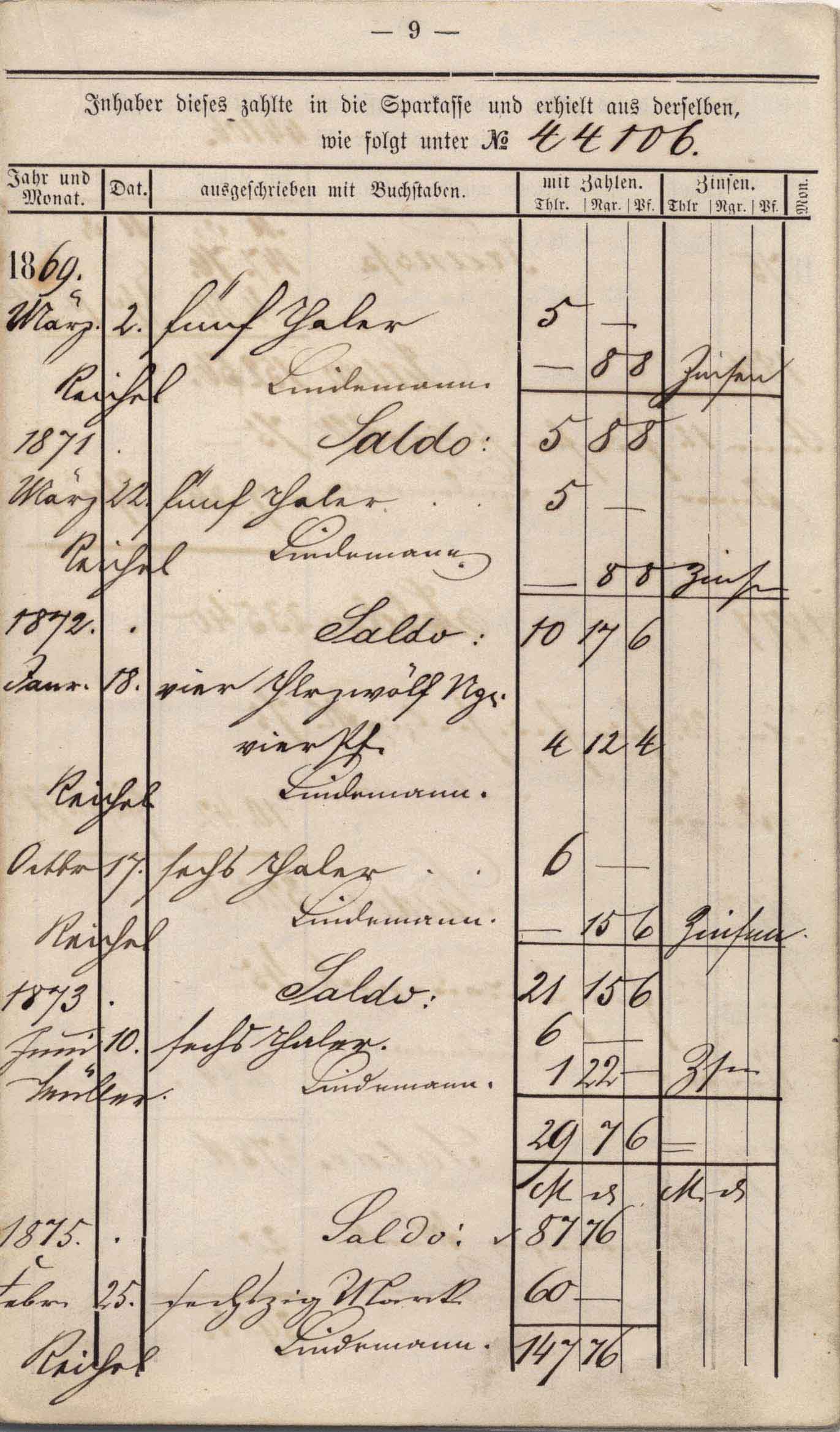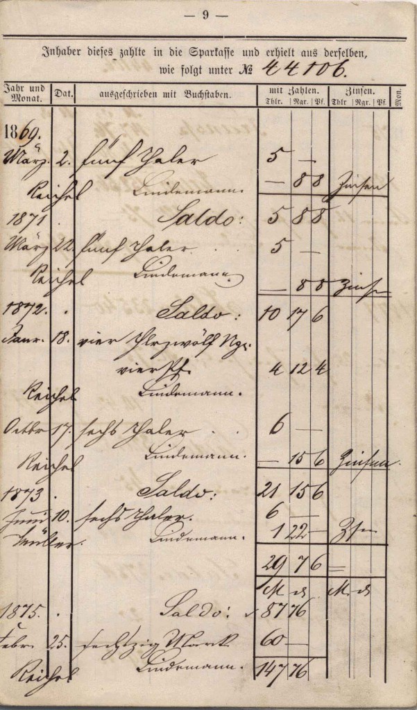 Das Sparkassenbuch selbst gehörte der Ururgroßmutter der Einsenderin. Es war im Jahr 1869 eines von insgesamt 3.022 Büchern, die neu eröffnet wurden. Damals stand die Sparkasse kurz vor ihrem 30-jährigen Jubiläum und war vorübergehend in einem Privathaus, bei der Kaufmannswitwe Wilhelmine Stäber, in der Klostergasse 4, untergebracht.