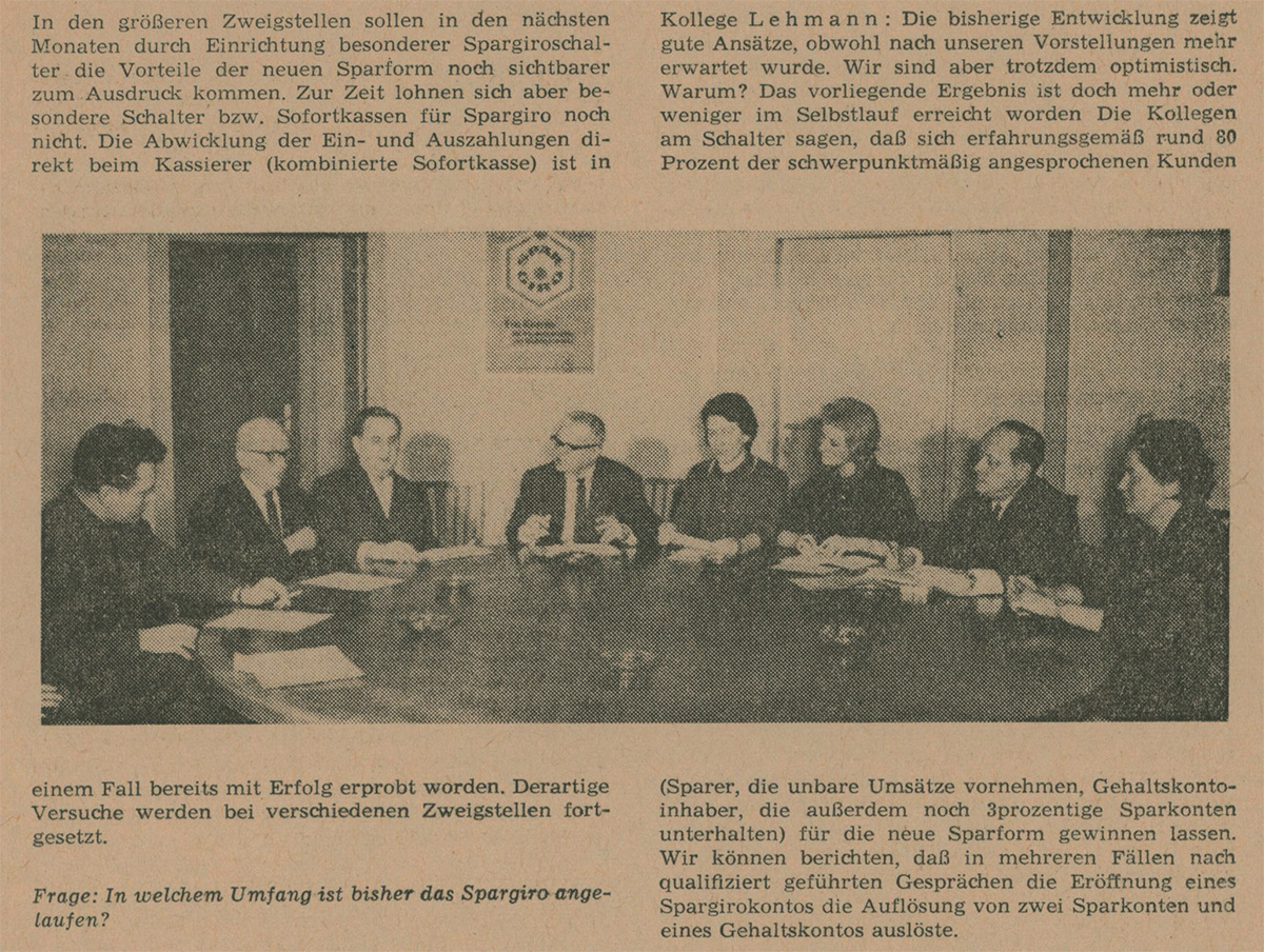 Im Jahr 1982 hatten sich zwei Kolleginnen besonders Mühe gegeben und eine kleine satirische Festzeitung verfasst. Sie enthielt Beiträge wie das „Sparkassen-ABC“, mit Einträgen wie zum Beispiel: