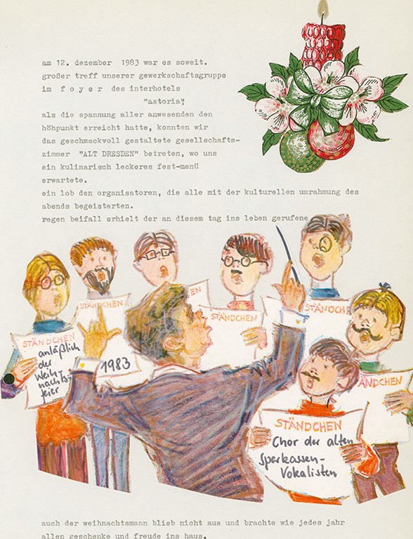 Doch wie wurde dies in der ehemaligen DDR gehandhabt? Einen Einblick geben uns die sogenannten Brigadebücher der Betriebe und Verwaltungen, hier beispielhaft das Brigadebuch des Arbeitskollektivs Gewerkschaftsgruppe M12 der Stadtsparkasse Dresden. Dieses Brigadebuch ist zusammen mit vielen weiteren als Depositum der Ostsächsischen Sparkasse Dresden in das Historische Archiv des Ostdeutschen Sparkassenverbandes gelangt und von uns Praktikanten in der Datenbank verzeichnet und erschlossen worden.