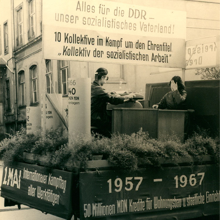 1. Mai – Internationaler Kampftag aller Werktätigen. Die Kreissparkasse Dresden war 1967 mit einem Lastkraftwagen bei der Demonstration dabei. Die in die DDR-Planwirtschaft eingebundene Sparkasse wies auf ihre Leistungen hin. Außerdem trug ein straßenseitig angebrachtes Schild die Losung „Durch Rationalisierung der Arbeit zu schnellerer Kundenbedienung“. Eine Frau hatte das mit ihrer Büromaschine zu veranschaulichen. Die Beschleunigung der Geschäftsvorfälle war unter anderem notwendig, weil sich der Kundenverkehr wegen der verkürzten Arbeitswoche auf fünf Tage zusammendrängte.