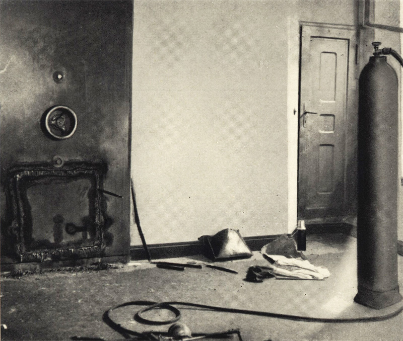 „Wie vielen Kreisinsassen erinnerlich, wurde in der Nacht vom Sonnabend, dem 31. August, zum Sonntag, dem 1. September 1929, von vier Berliner bewaffneten Berufseinbrechern ein Einbruchsversuch an der rechten Stahlkammer der Tresoranlage vorgenommen. Trotz modernster Einbruchswerkzeuge, zu denen auch ein großes Sauerstoffgebläse gehörte, und trotz ungestörter Arbeit während der ganzen Nacht misslang der Versuch, in das Innere des Tresors zu gelangen, da die Panzerung der Tür allen Anstrengungen der Einbrecher widerstand.