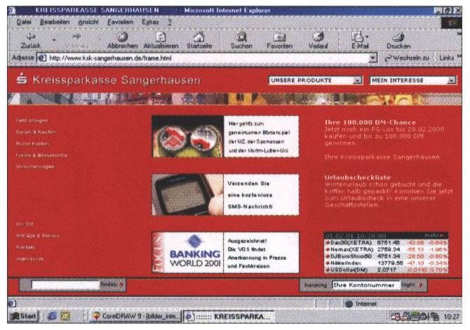 Bei der Kreissparkasse Sangerhausen fand die Eröffnung des weiteren Vertriebsweges am 1. September 2000 im Rahmen des Altstadtfestes statt. Um sich für das Online-Banking fit zu machen, nutzten zu dieser Zeit viele Menschen die von der Sparkasse und der Kreisvolkshochschule gemeinsam angebotenen Kurse. Es ging nicht nur um die Verwaltung des Kontos von zu Hause aus. Man konnte zum Beispiel auf der Sparkassen-Homepage ein kostenloses Musterdepot führen und sein eigenes „Börsenspiel“ starten. Unter anderem bot die Seite einen großen Immobilienteil und Finanzierungsangebote. Als regionales Geldinstitut wollte die Sparkasse auf Veranstaltungen hinweisen, natürlich auch auf solche, die sie selbst unterstützte. Vielfältig war das Angebot, das noch ausgebaut wurde.