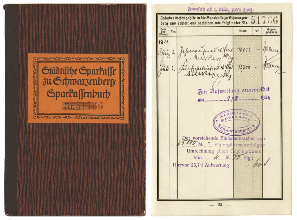 Ein weiteres Sparbuch aus unserem Archivbestand, das seinen Weg in die Sonderausstellung des Deutschen Historischen Museums gefunden hat, möchte ich Ihnen heute vorstellen. Es stammt aus Schwarzenberg im Erzgebirge und verdeutlicht die Wirkungen der Inflation Anfang der 1920er-Jahre. Der Inhaber dieses Buches hatte durch seine Einzahlungen im Jahr der Hyperinflation ganze 25.000 Mark auf dem Konto. Dies waren aber in der neuen Währung lediglich 0,000.000.025 Reichsmark. Eine Billion Mark entsprachen einer Reichsmark.