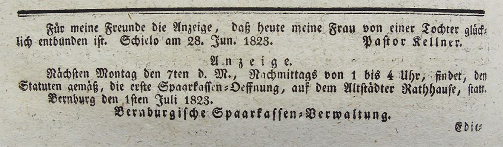 „Unter höchster Genehmigung Seiner ältestregierenden Herzoglichen Durchlaucht, haben die Unterzeichneten, in Verbindung mit mehreren Freunden, unternommen, für die Stadt Bernburg eine Sparkasse zu errichten, und durch dieselbe zur Beförderung des Wohlstandes des Ortes beizutragen, indem den unbemittelten Einwohnern Gelegenheit verschafft wird, sich durch Sammlung ihrer kleinen Ersparnisse Vermögen zu erwerben, und solches durch zinsbare Anlage auf eine rechtmäßige Art zu vergrößern, welches bei Verheirathungen, Anfang eines Gewerbes, oder im Alter und in Nothfällen zu ihrer Hilfe gereichen kann; Andern aber, die schon ein kleines Vermögen besitzen, dasselbe sicher und nützlich anzulegen.“