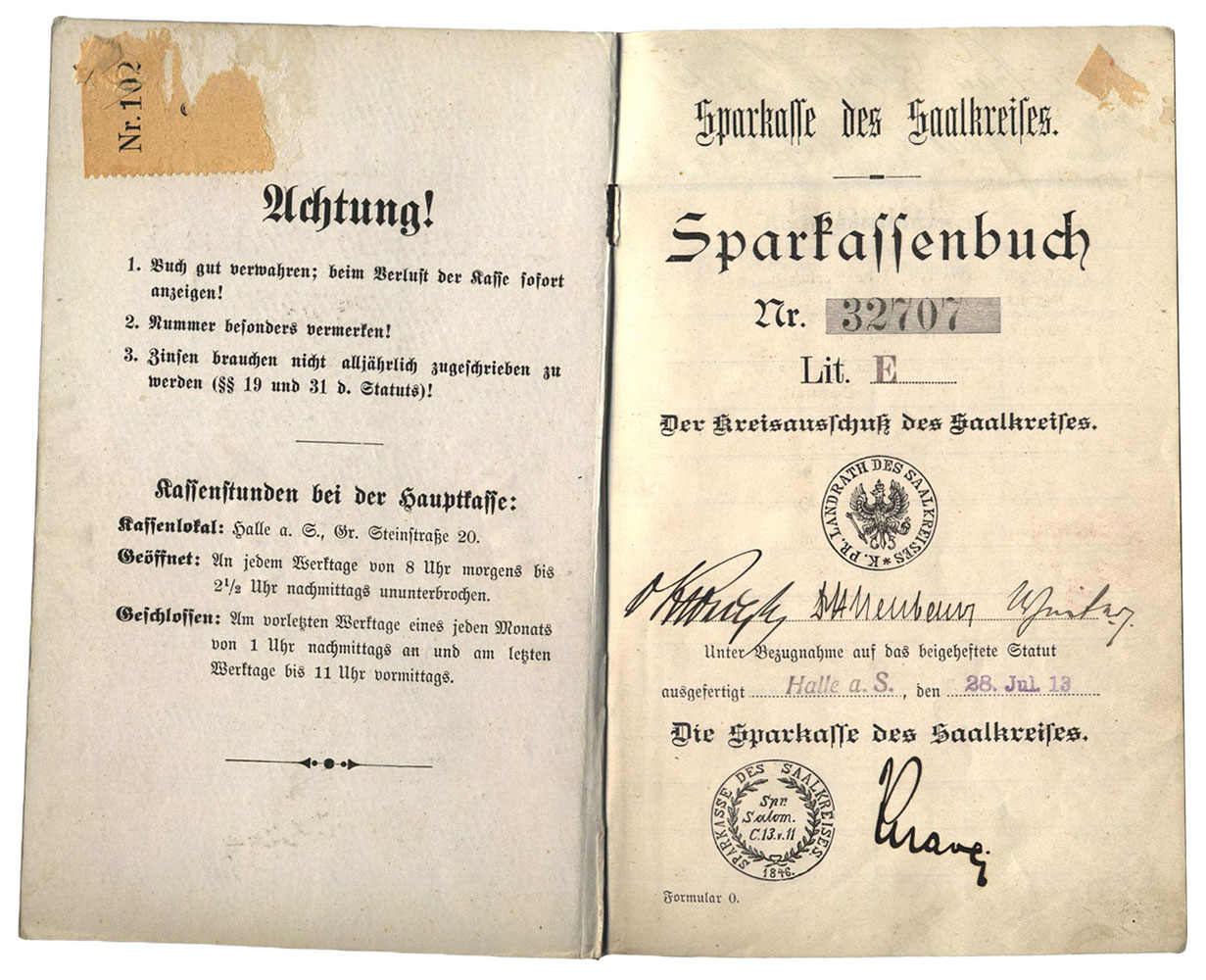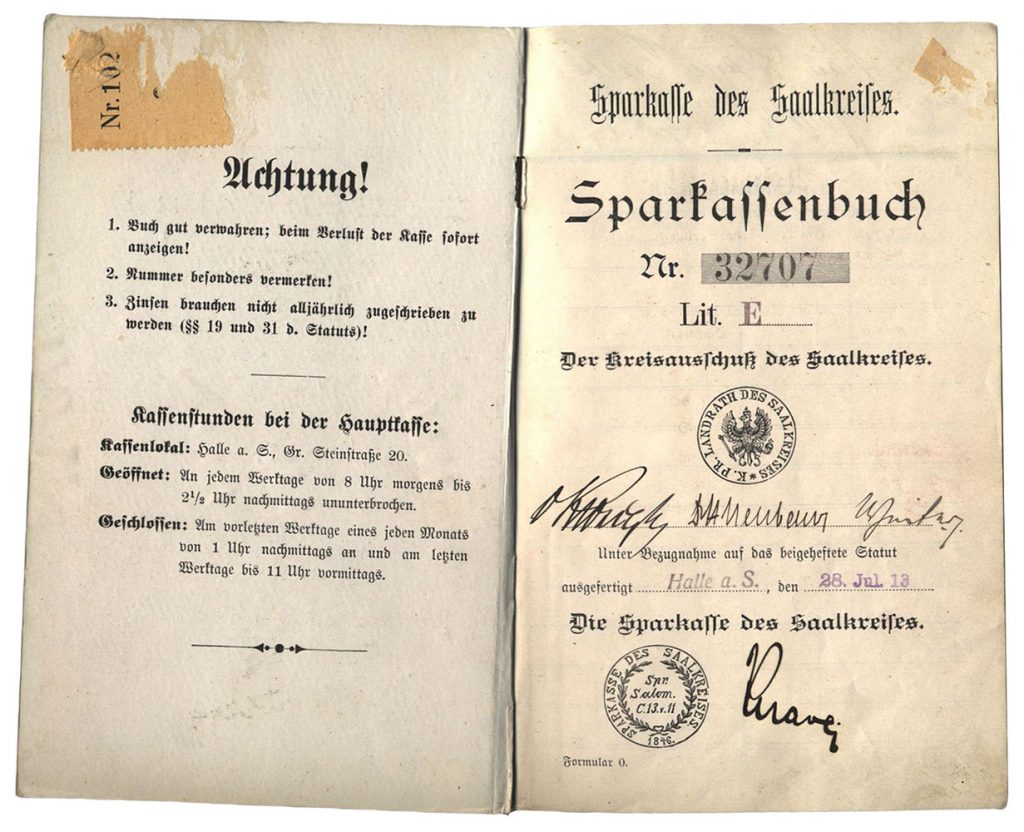 In anderen Blogbeiträgen wurden Ihnen bereits interessante Werbemittel vorgestellt, mit denen die Stadtsparkasse in Halle (Saale) nach der Inflation 1923 das Sparen wiederbeleben wollte. Die Hyperinflation hatte die Sparguthaben von Generationen entwertet. 11,3 Billiarden Mark betrugen die Einlagen bei der Sparkasse. Dies entsprach lediglich 11.300 Reichsmark. Nur ein kleiner Teil des Kundenvermögens konnte gemäß gesetzlicher Vorschriften aufgewertet werden. Trotz des schweren Rückschlags sparten die Menschen wieder. Sie vertrauten auf eine neue stabile Währung und schufen sich Rücklagen.