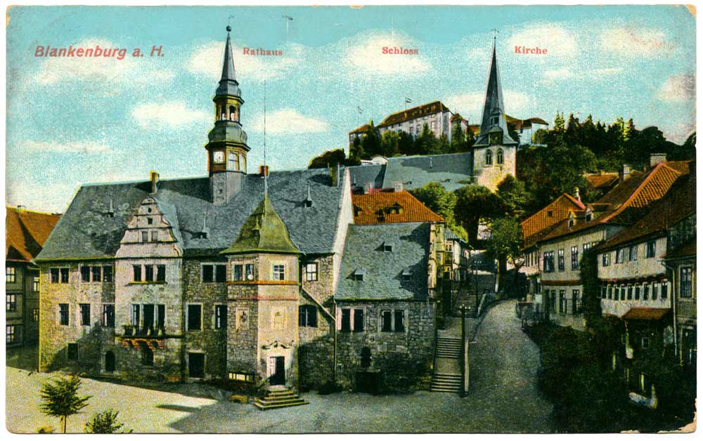 In Blankenburg am Harz ist die Sparkasse seit 180 Jahren vor Ort. (Ansichtskarte Verlag C. Greve in Blankenburg, versendet 1912; Bestand: Historisches Archiv des OSV)