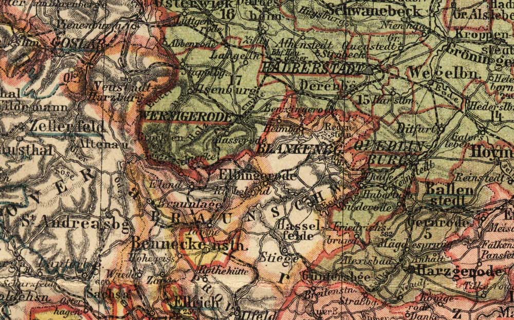 Früher gehörte die Stadt zum Land Braunschweig. Heute liegt sie im Bundesland Sachsen-Anhalt. (Ausschnitt Landkarte von 1912; Bestand: Historisches Archiv des OSV)